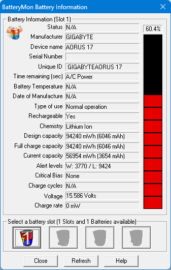 사용 중인 노트북의 배터리는 94Wh인데 용량은 6Ah입니다. 전압은 약 16V입니다.