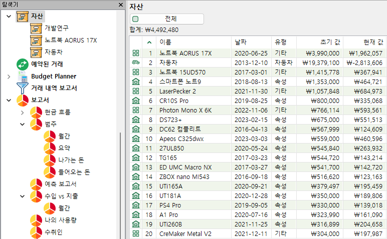 자산 계정에는 유형별로 계정을 만듭니다. 자산 계정은 집, 자동차, PC, 개발처럼 거래 기록들의 집합이 될 주제가 될 수 있으며, 낱개 상품이 될 수도 있습니다. 자산 집합은 그림의 왼쪽처럼 계정 형태로 나타나며 거래를 기록할 때 계정 목록에 나타납니다. 개별 자산은 그림의 오른쪽처럼 목록으로 볼 수 있습니다.