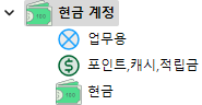 현금 계정에는 실물 현금을 등록하면 됩니다. 필요한 경우 페이, 포인트, 캐시, 마일리지 계정을 등록하면 됩니다. 계정 설정에서 닫힘으로 설정하면 잔액 계산이나 보고서에 포함되지 않습니다.