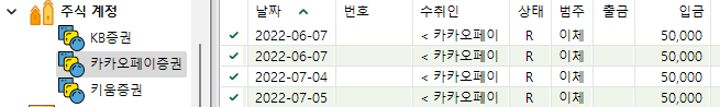 주식 포트폴리오에는 펀드, 주식을 관리하는 계정을 등록합니다. 예를 들면 카카오페이증권은 펀드, 국내 증권, 해외 증권 등으로 나뉘어 있으므로 각 계정으로 등록합니다. 날짜별로 기록하고 흐름을 보는 것이 목적이므로 장기 보유를 하는 펀드나 주식에 적합합니다.