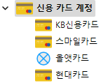 신용 카드 계정에는 카드 번호 형식으로 발급된 유형을 등록합니다. 체크카드는 현금과 같이 실제 금액으로 즉시 결제하는 수단이므로 연결된 은행 계정으로 사용하면 됩니다. (예: KB체크카드는 KB국민은행 계정에서 기록)