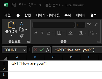 GPT for Excel Word를 설치해 보았습니다. GPT는 함수로 사용할 수 있습니다.
