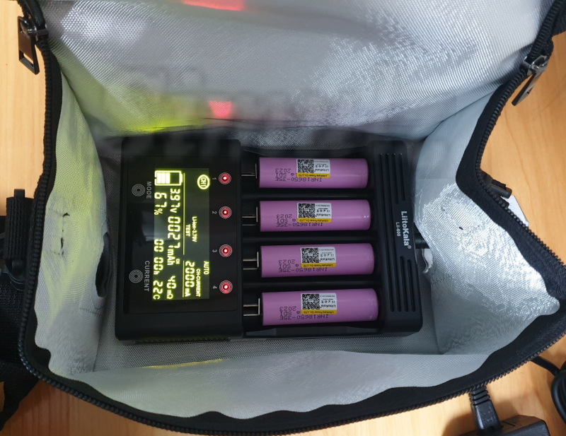 거대한 Lii-600 충전기가 여유있게 들어갈 정도로 내부 공간이 넉넉합니다. 그런데, 온도 센서가 있는 Lii-600 충전기를 사용할 때에는 보호 가방이 사치일 수도 있겠습니다.