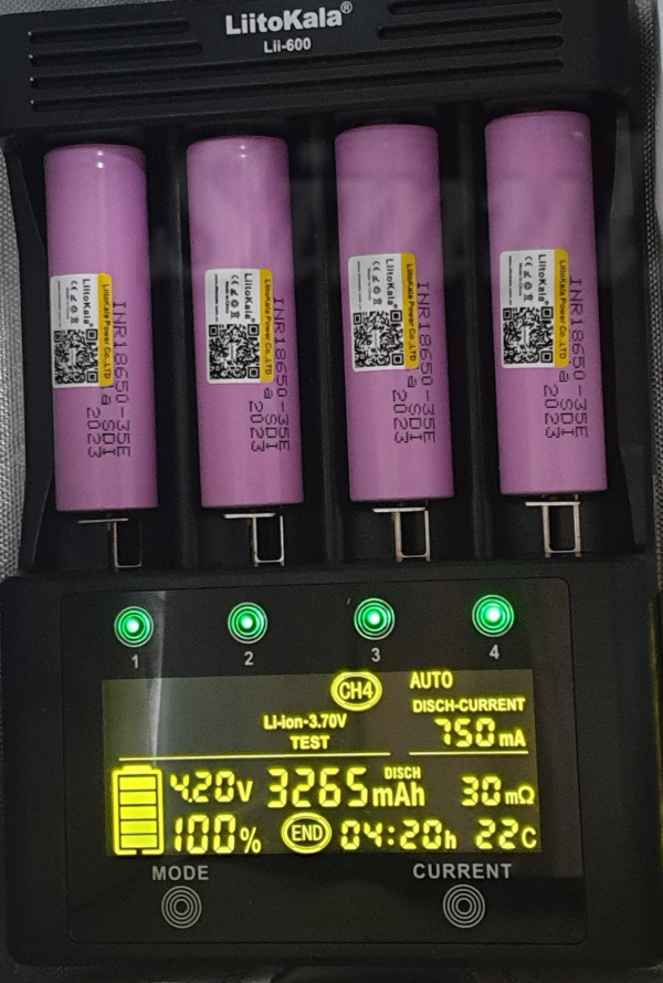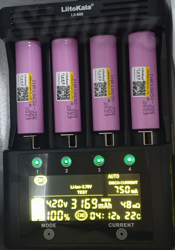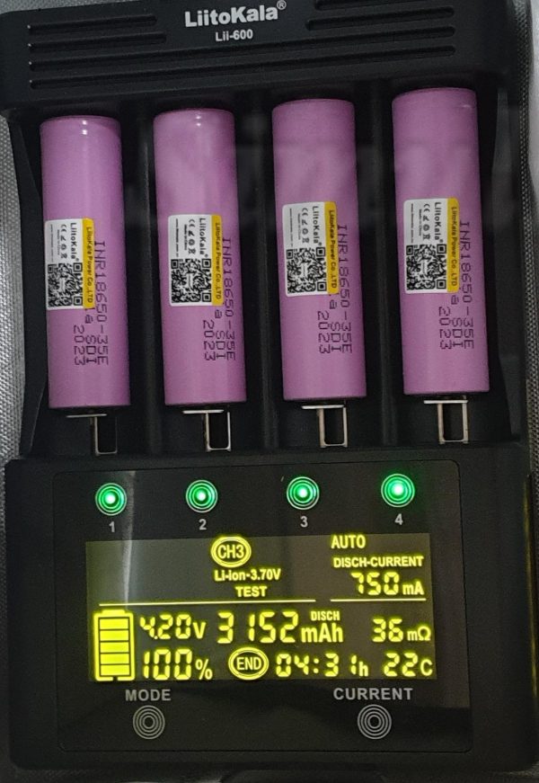 3152~3265mAh로 측정되었으며 35E 배터리의 실제 용량과 거의 비슷합니다. 3500mAh로 광고하는 배터리의 실제 용량은 3350mAh가 대부분입니다. 용량 차이가 발생하는 이유는 방전 종지 전압과 방전 전류, 계측기 조건이 다르기 때문입니다. 빨리 끝내려고 750mA 방전을 선택했는데 전류량이 큰 만큼 오차도 큽니다. 정확하게 테스트 하려면 250mA를 권장합니다.