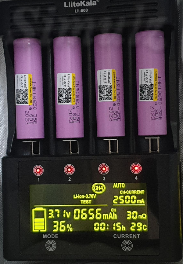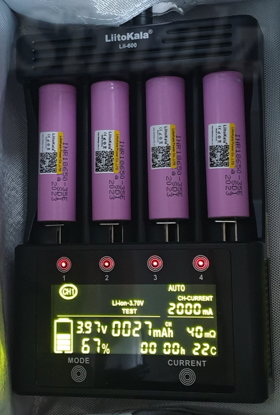 방전을 할 때에는 충전기 저항에 250, 500, 750mA 전류를 흘리기 때문에 발열이 심해집니다. 50℃를 넘어갑니다. Lii-600 충전기는 온도 센서가 있기 때문에 안전합니다. (사진에서는 선풍기를 틀었기 때문에 온도가 낮게 표시되었습니다.)