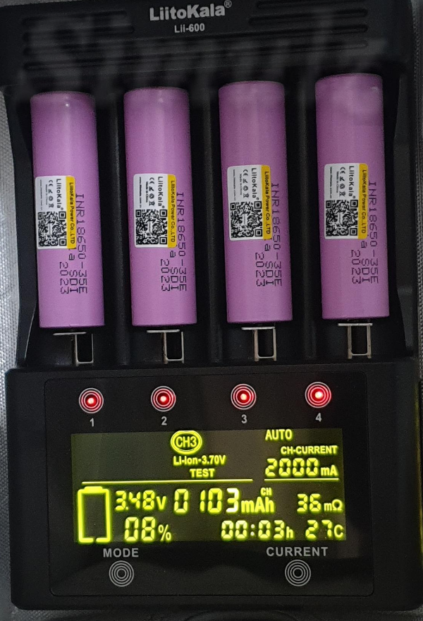 35E 배터리의 내부저항 사양은 35mΩ 미만인데, CH1의 내부저항은 48mΩ입니다. 내부 저항이 높으면 충·방전 전류가 낮아집니다.