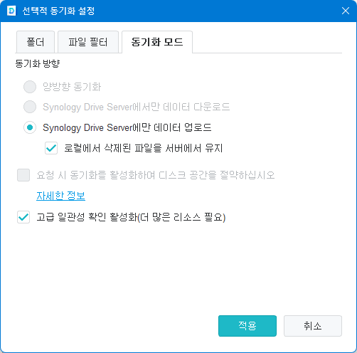동기화 모드 탭에서 데이터 업로드만 허용된다.