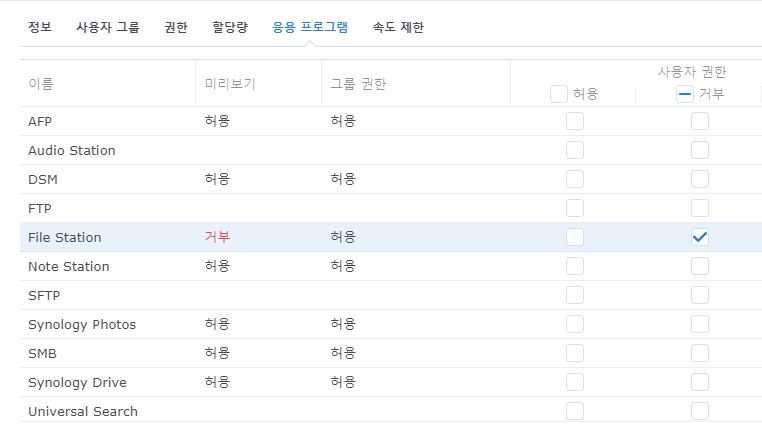 사용자 속성 - 응용 프로그램 탭에서 File Station 권한 거부를 선택한다. 그리고 팀 폴더의 권한은 읽기 전용으로 설정한다.