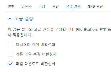 공유 폴더 속성 - 고급 권한 - 고급 설정에서 파일 다운로드 비활성화 항목을 선택한다.