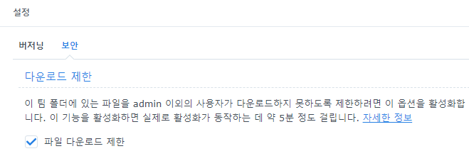 보안 탭에서 파일 다운로드 제한 옵션을 선택한다.