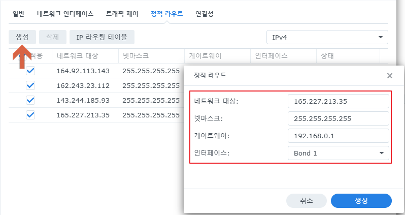 네트워크 대상 입력 상자에 DDNS 네임서버 IP를 하나씩 입력합니다. 넷마스크는 255.255.255.255로 입력합니다. 게이트웨이는 공유기의 IP를 입력합니다. 인터페이스는 기본 LAN 프로파일을 선택합니다. 생성 버튼을 눌러 등록합니다. 같은 방법으로 위 IP를 모두 등록합니다.