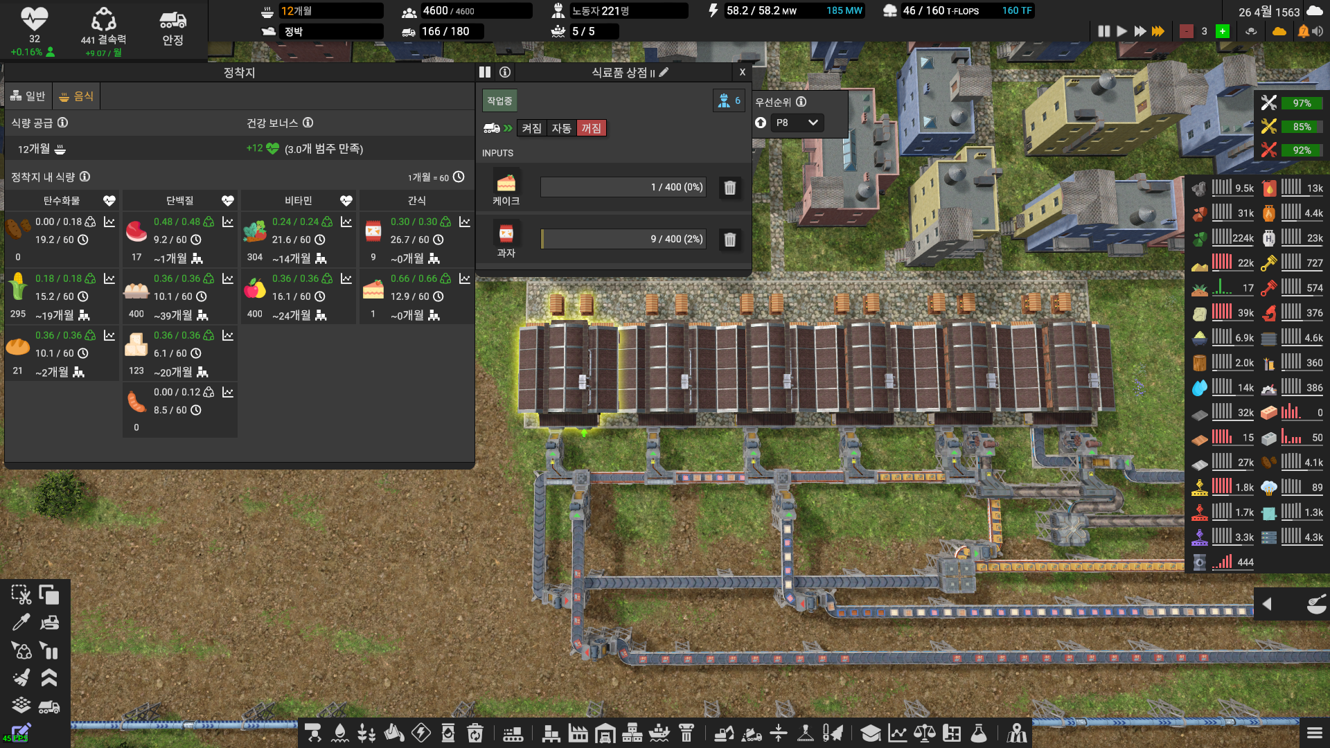 식량은 크게 네 가지로 분류되는데, 탄수화물·단백질·비타민·간식 4가지 중 간식을 제외한 3가지는 모두 공급되도록 하는 것이 좋다. 종류별로 건강 보너스가 +4씩 증가하여 인구가 빨리 늘어난다. 상점과 컨베이어가 멈출 때 다른 영양분이 공급되는 걸 막지 말아야 한다.