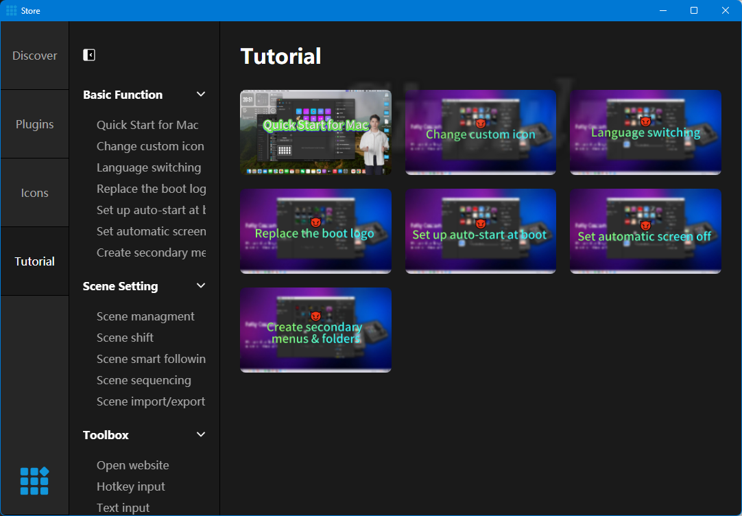 프로그램의 Store 버튼을 누르면 Tutorial 탭에서 사용법에 대한 유튜브 영상 목록을 볼 수 있습니다.