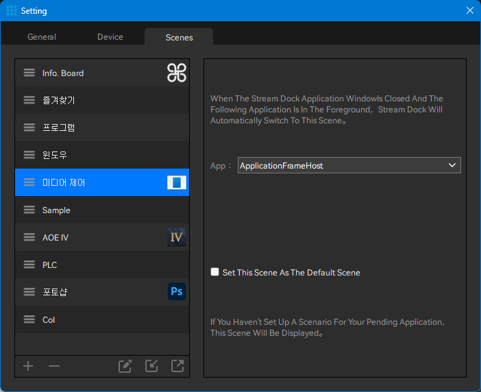 설정에서 각 씬에 앱 실행파일을 연결하면 앱이 실행될 때 해당 씬을 자동으로 보여줍니다. Stream Dock 창이 닫혀있을 때에만 동작합니다.