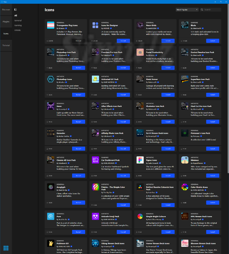 뭔가 엄청나게 많은 플러그인을 볼 수 있습니다. Install 버튼을 누르면 설치됩니다. 또는 직접 파일을 내려받아서 %AppData%\HotSpot\StreamDock 폴더에 압축을 풀면 됩니다.