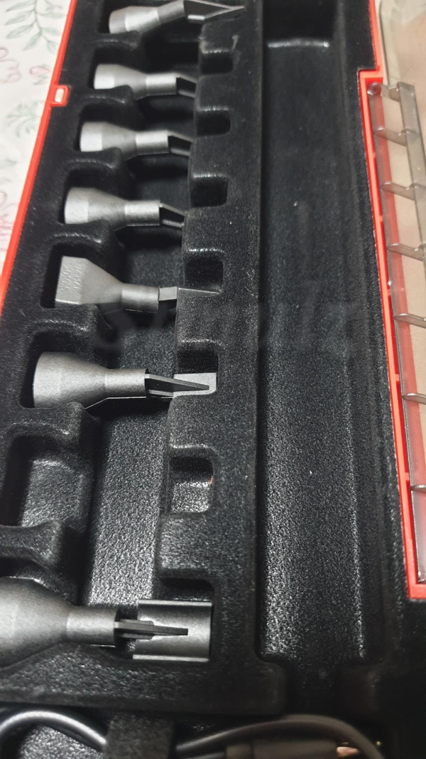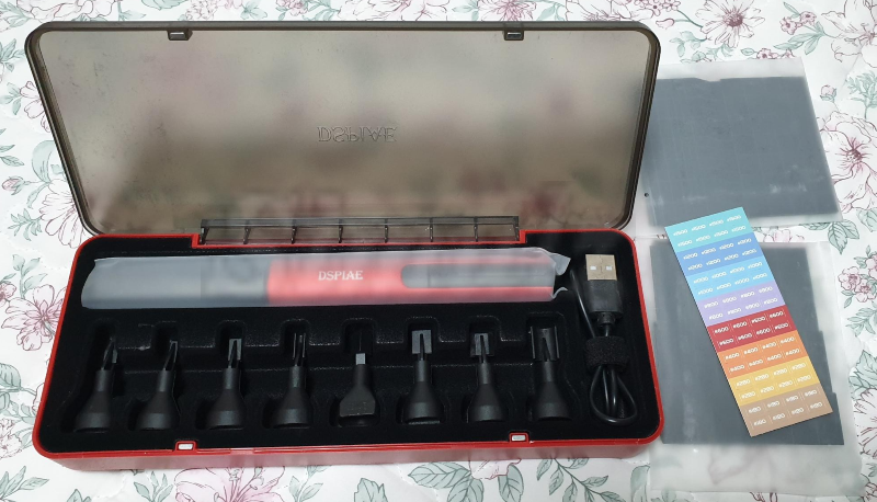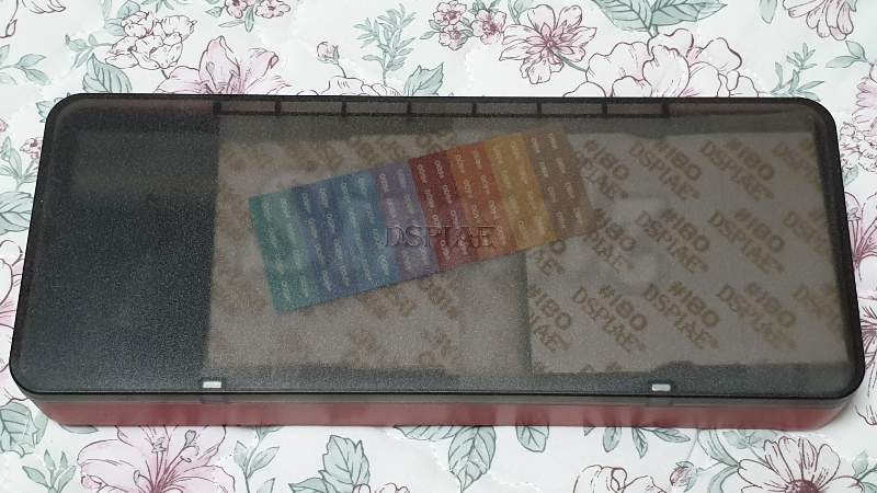 보관함을 열면 제품, 팁 8종, 사포 여러 장, 거칠기 표시 스티커가 들어있습니다.
