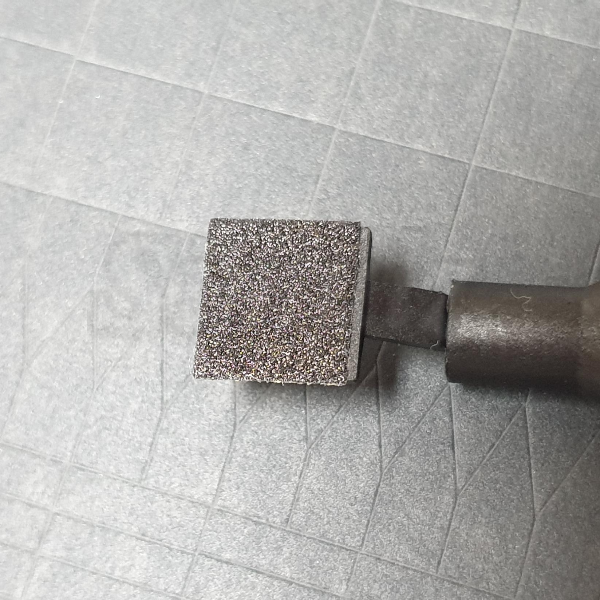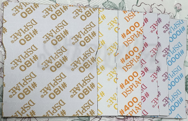 넓적팁에 #180 사포를 붙여 보았습니다. 접착식이기 때문에 한 번 붙이면 닳을 때까지 써야 합니다. 그래서 팁만 추가 주문하면 사포 모양과 거칠기에 따라 다양하게 사용할 수 있습니다.