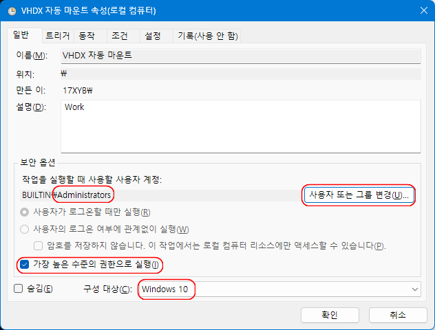 작업을 실행할 때 사용할 사용자 계정에서 사용자 또는 그룹 변경... 버튼을 눌러 Administrators를 선택합니다. 파일을 실행하는 권한은 파일의 소유자나 관리자에게 있기 때문입니다.