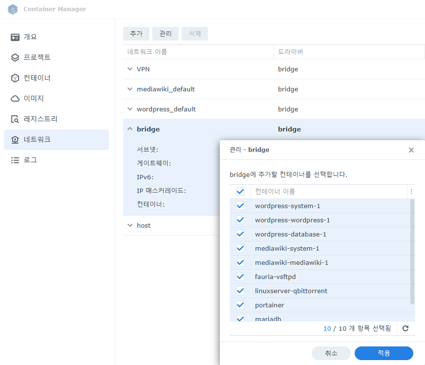 HTTP 백엔드 서버를 보면 Nginx가 보이는데, 이 도커 컨테이너는 웹스테이션의 서버를 사용하는 것을 알 수 있습니다.