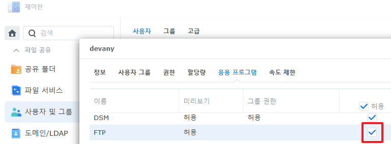 접속에 사용할 NAS 사용자 설정에서 응용 프로그램 - FTP 권한을 허용합니다.