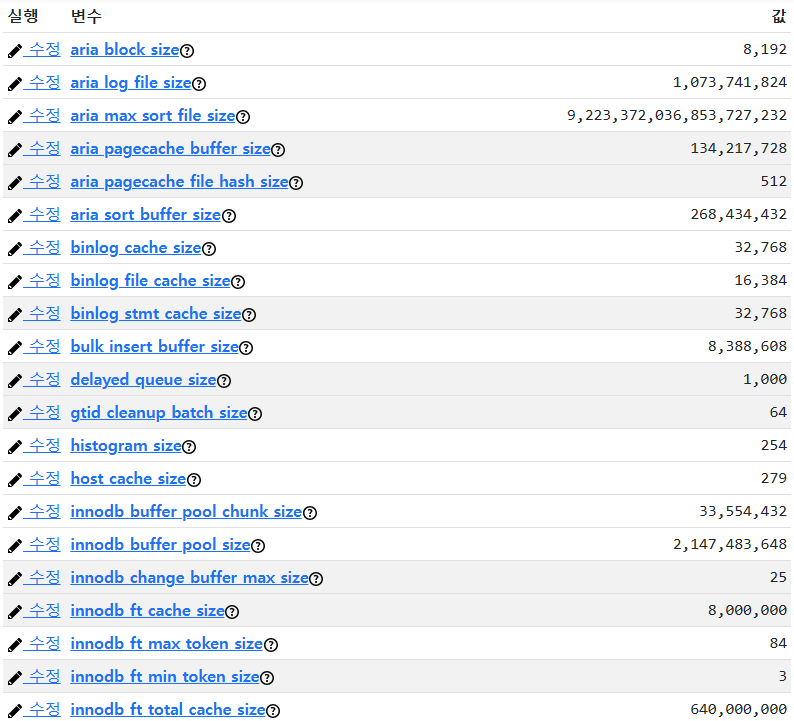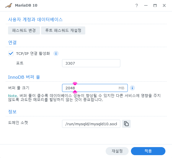 MariaDB 문서에서도 기본값이 128MiB인데 시놀로지는 16MiB이다. DS7시리즈 램이 기본 2GB인데, 이건 너무 심하다. 지금은 16GB를 추가했으니 값을 변경해도 충분하다. 2048MB로 수정한다.