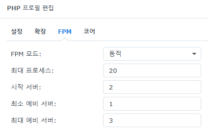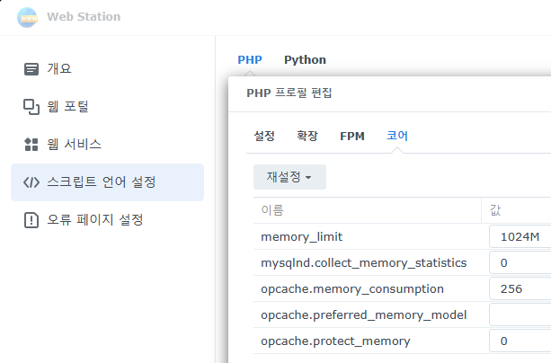 Web Station - 스크립트 언어 설정 - PHP 프로파일 편집 - 코어로 이동한다. 7.4, 8.0, 8.2 버전 모두 필요에 따라 설정을 변경한다.