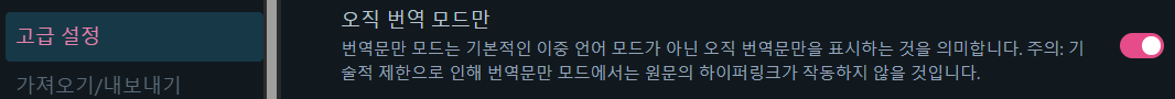 확장 설정 - 고급 설정 - 오직 번역 모드만 항목을 켭니다.