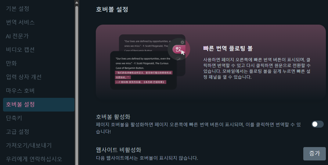 페이지 우측 중간에 플로팅 버튼이 항상 떠있습니다. 이것이 불편하다면 웹사이트 비활성화에 사이트 주소를 추가하거나, 호버볼 활성화 항목을 끕니다.