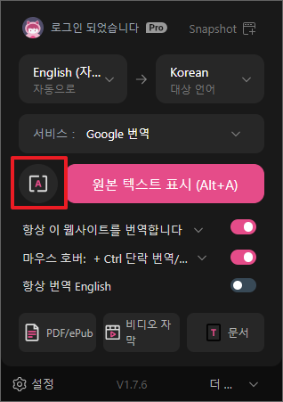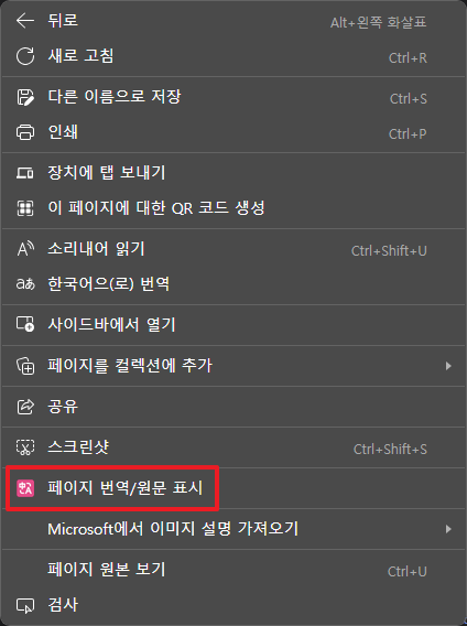 페이지 전체를 전환하려면 단축메뉴에서 페이지 번역/원문 표시 항목을 누르면 됩니다. 새로고침이 필요 없습니다. 단축키는 Alt+W이며 브라우저 설정에서 변경할 수 있습니다.