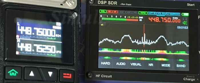 무전기에서 송신 버튼을 누르는 순간 448.75MHz 기준으로 전파가 강하게 수신되고 있습니다. Wide로 설정했더니...