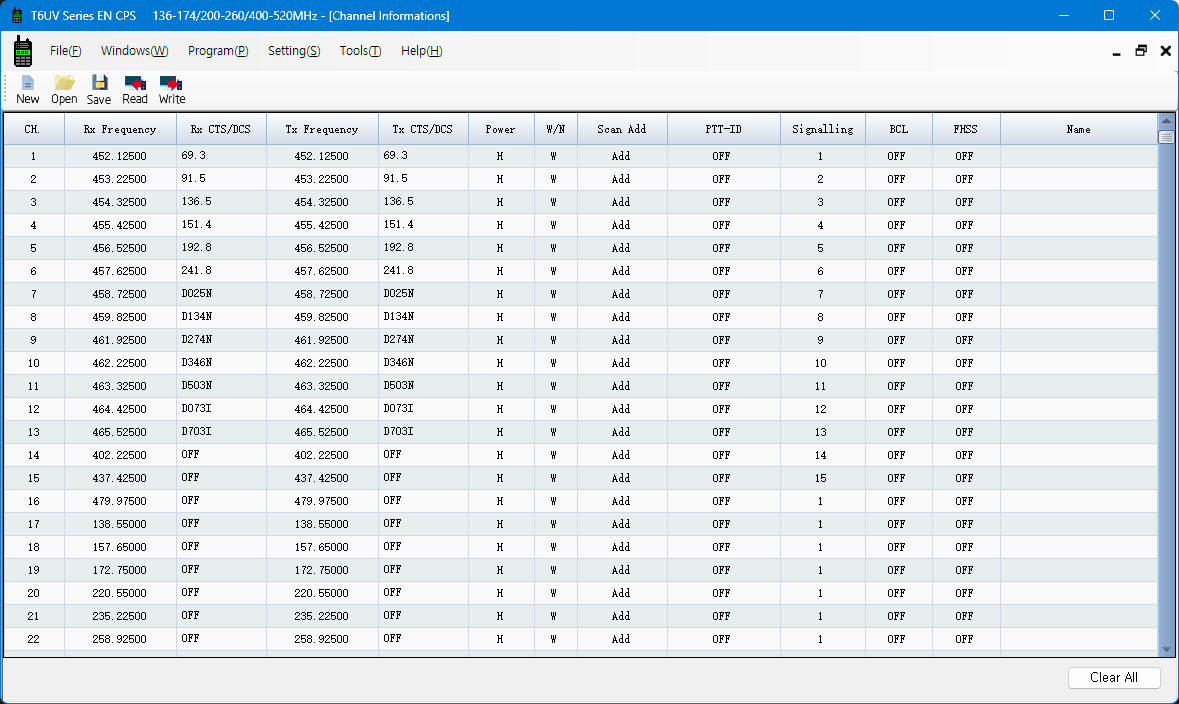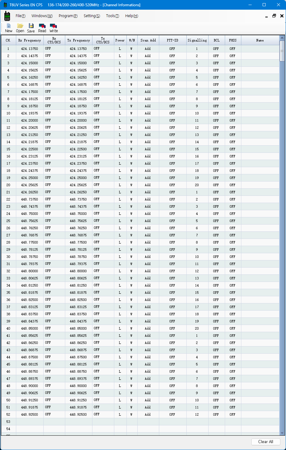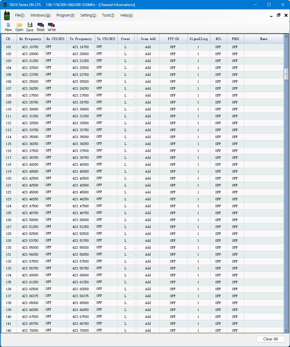 Name 열에는 무전기에서 표시할 영문자 이름을 입력합니다. 무전기의 고유 채널은 CH001~999이지만, 수 많은 주파수를 등록하여 사용할 경우 무슨 주파수인지 알기 어렵기 때문에 무전기에서 인지하기 쉽도록 별칭을 입력합니다. 예) FRS-01