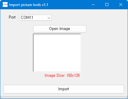 160x128, 16bit BMP 이미지를 불러온 후 Import를 누르면 전송됩니다.