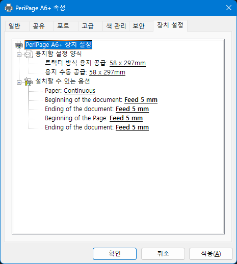 프린터 속성에서 장치 설정 탭으로 이동합니다.