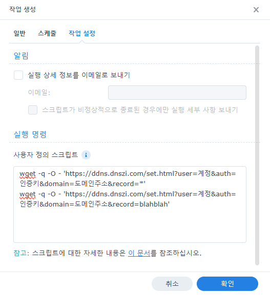 wget -q -O - 'https://ddns.dnszi.com/set.html?user=계정&auth=인증키&domain=도메인주소&record=*'