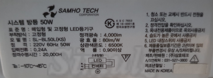 5만원이었나? 사용한지 몇년 되지도 않은 삼호테크의 50W LED방등. 4000루멘이라 방에서 쓰기에 딱 좋은 밝기입니다.