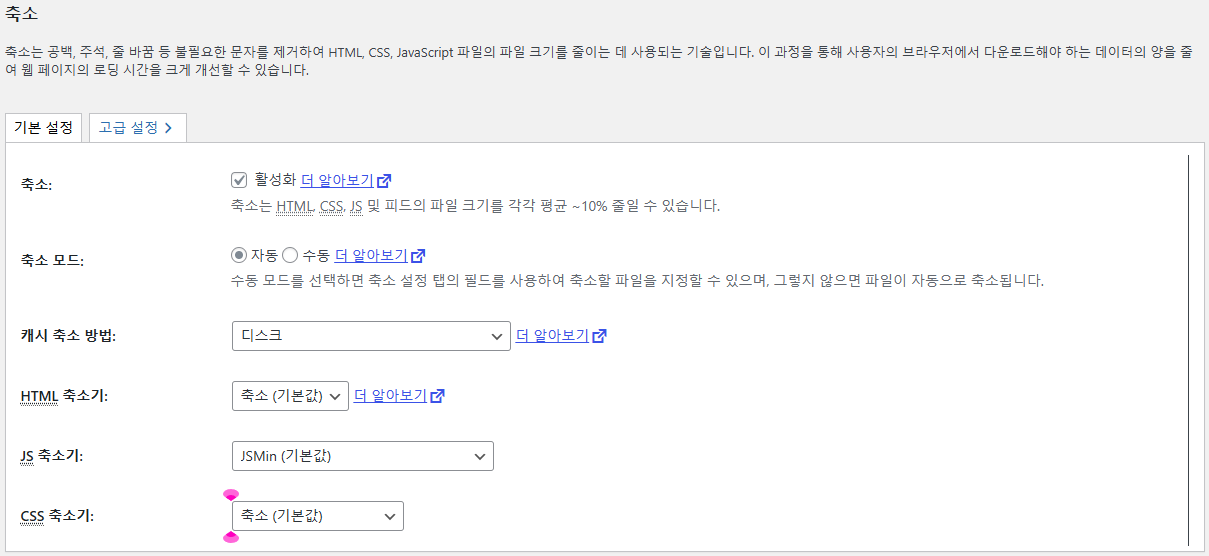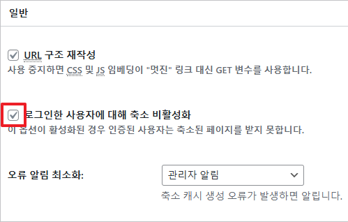 해결하려면 로그인 사용자는 축소를 하지 않는 설정을 켜야 한다. 트래픽이 사이트에 영향을 주지 않으면 축소 기능을 꺼도 된다.