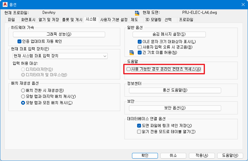 반응형 도움말을 보려고 하면 빈 페이지만 나타납니다. OPTIONS 명령어를 실행하거나 작업공간 단축메뉴에서 옵션을 선택합니다. 시스템 탭에서 도움말 그룹의 체크박스 선택을 해제합니다. 짜장~ 반응형 공유하기 게시글 관리 잡동사니 저작자표시 비영리 변경금지 (새창열림)