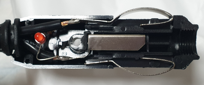 전선은 두꺼운 철판에 납땜되어 있습니다. LED에 연결된 저항값은 202이므로 2㏀입니다. 표시용 LED이므로 저항값은 적당합니다.