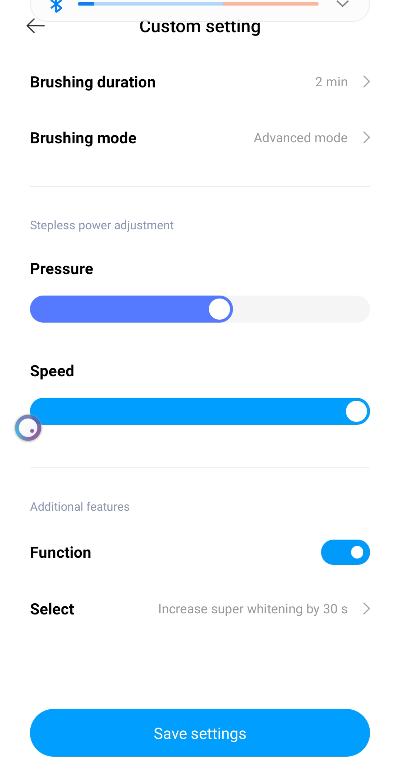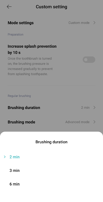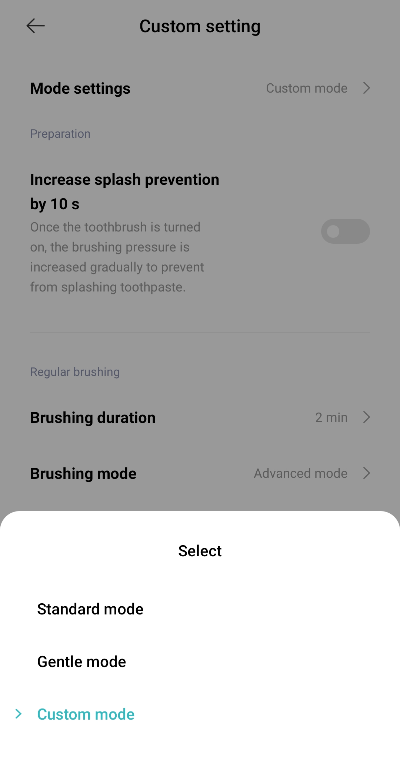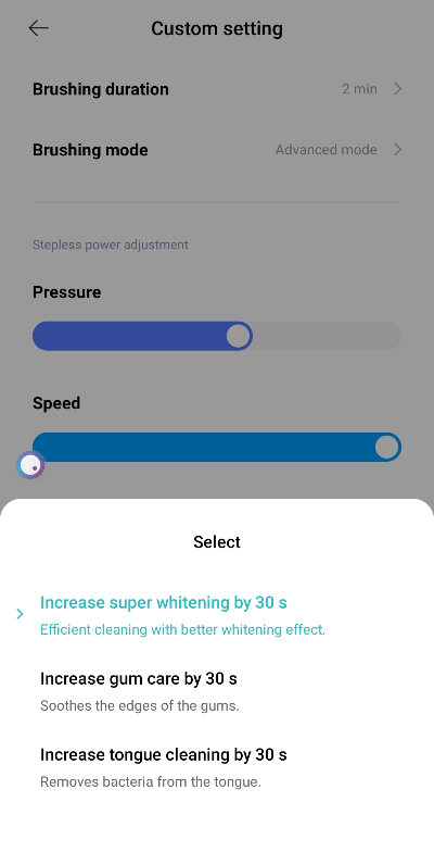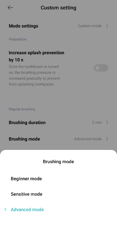 Brushing mode를 Advanced mode로 설정하면 추가 기능을 사용할 수 있습니다. 칫솔에서는 ❤️ 모드를 선택하면 됩니다.
