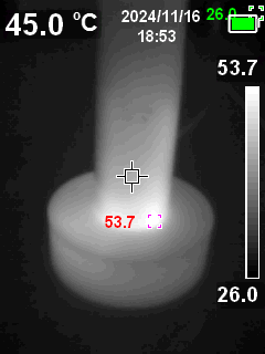 충전 중에는 상당한 열이 발생합니다. 칫솔 본체 표면 온도가 53.7도를 기록했습니다.