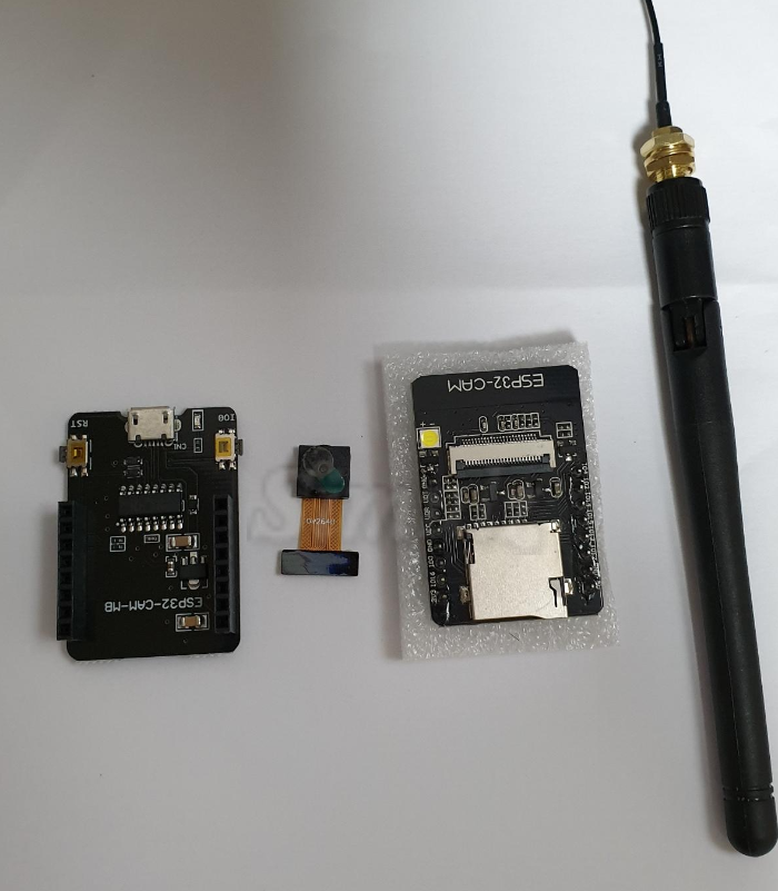ESP32 모듈, USB-micro 모듈, 카메라 모듈, 안테나 포함입니다.