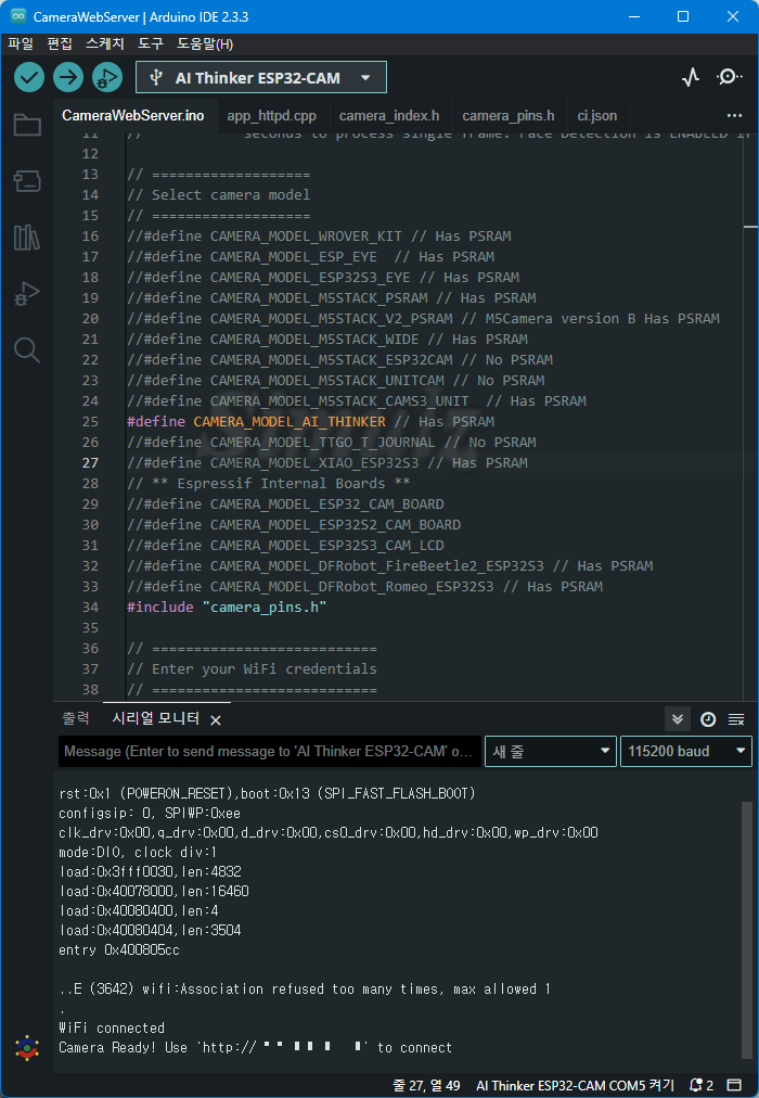 코드 중 #define 카메라 모델에서 CAMERA_MODEL_AI_THINKER 만 주석 해제합니다.