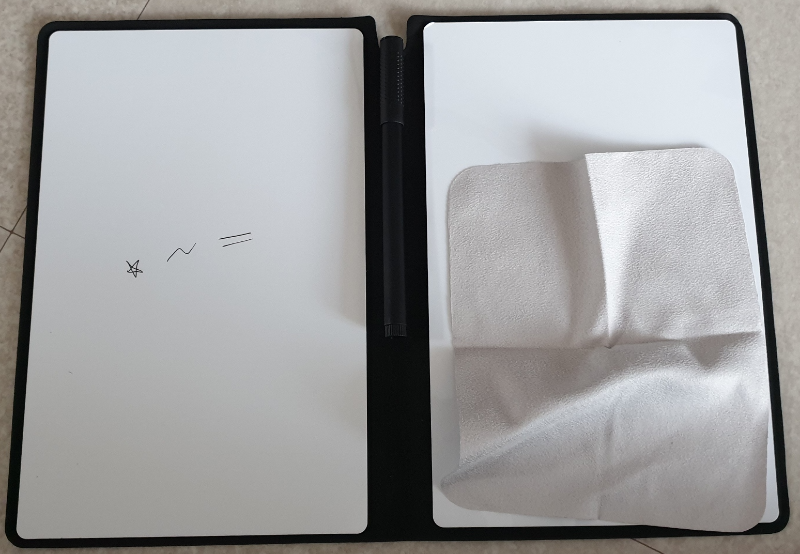 내용물은 두 면으로 된 화이트보드, 검정 수성펜, 클리너 구성입니다. 융은 보들보들하니 잘 닦입니다. 안경 닦이로도 굿!