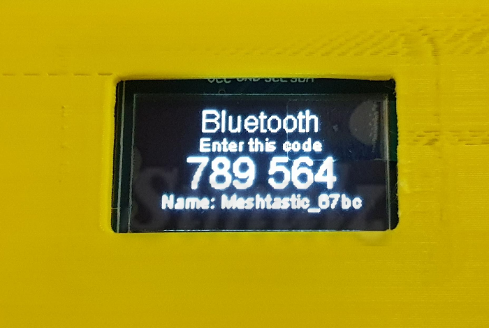 매시타스틱을 연결해봅니다. 스마트폰 앱에서 블루투스 연결을 시도하면 T-Beam의 OLED 화면이 아래처럼 바뀝니다.