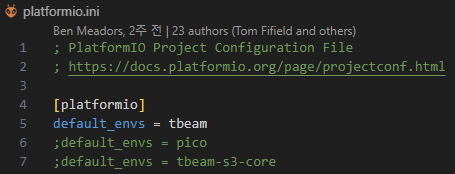 platformio.ini 파일을 열고 default_envs = tbeam 줄을 주석해제 합니다.
