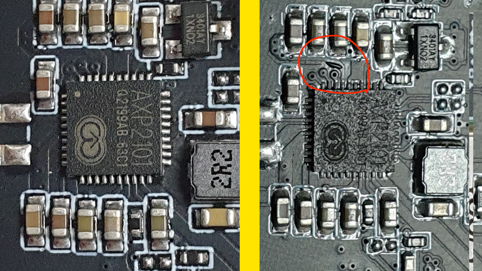 T-Beam V1.2 모듈을 처음 개봉 후 찍었을 때와 며칠 사용 후 찍었을 때의 사진이다. AXP2101 주변의 패턴 중 VBUS로 생각되는 패턴의 코팅이 부풀어 오른 것을 볼 수 있다.