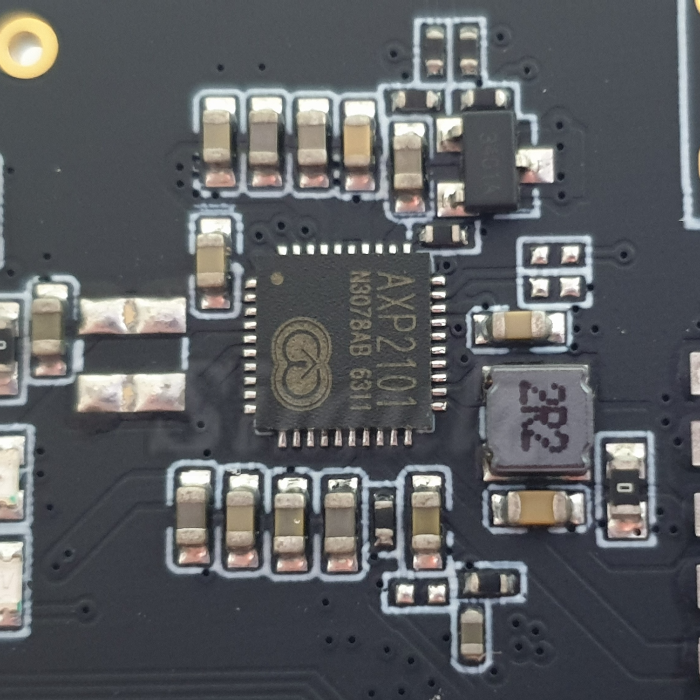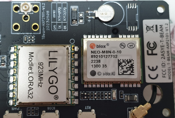 전원 관리 모듈인 AXP2101. LILYGO LoRa 923 MHz 모듈과 NEO-M8N GNSS 모듈이 보입니다. LoRa 안테나 커넥터 자리에는 IPEX 커넥터가 부착되어 있습니다.