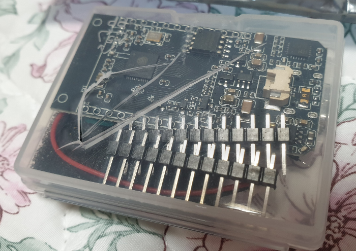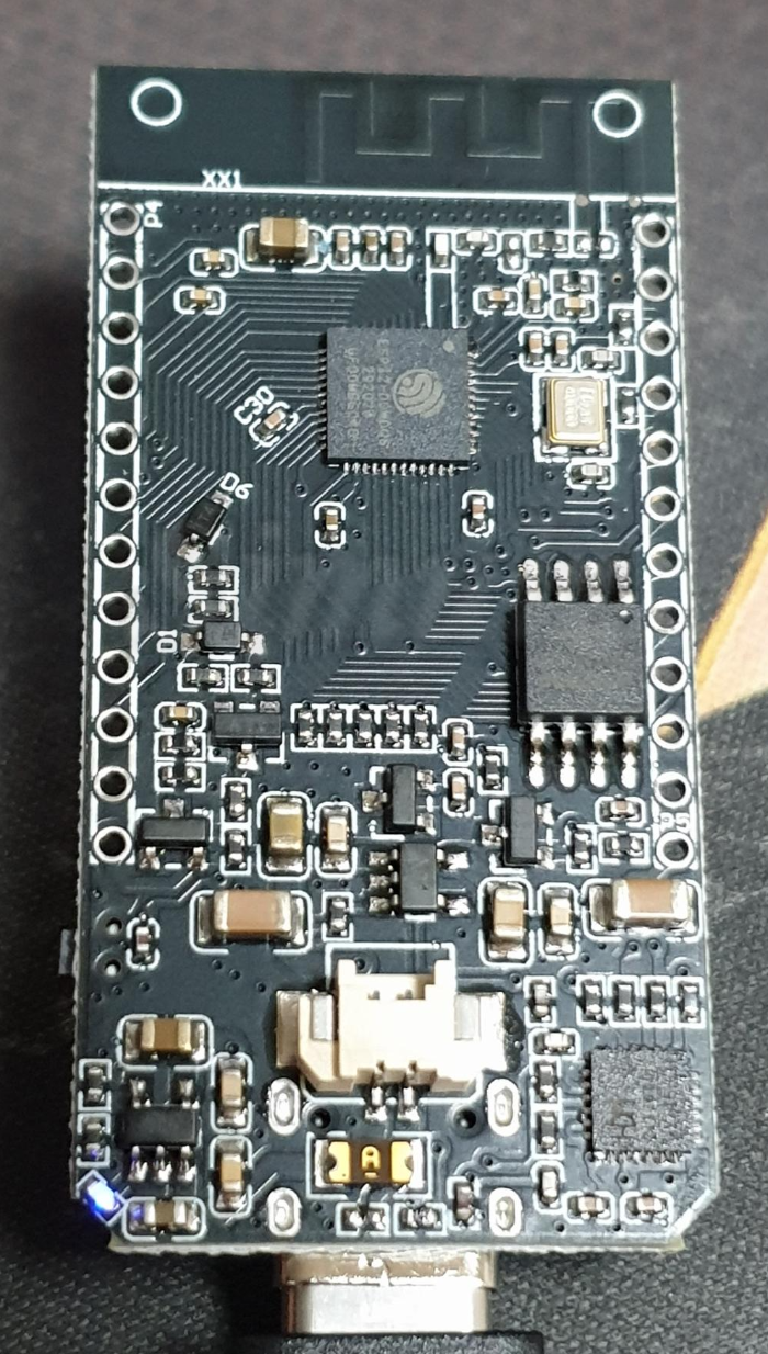 제일 흔한 ESP32 칩셋. 배터리 연결 커넥터가 있어 휴대용 장치를 만들 수 있습니다. USB 연결이 되면 파란 LED가 약하게 켜집니다.
