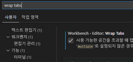 설정에서 wrap tabs를 검색하고 해당 설정 항목을 체크합니다.