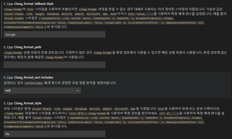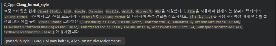 설명과 같이 설정 값을 사용자 지정할 수 있습니다. C_Cpp.clang_format_fallbackStyle 또는 C_Cpp.clang_format_style 설정 항목에 입력합니다. C_Cpp.clang_format_style 설정이 우선 적용됩니다.